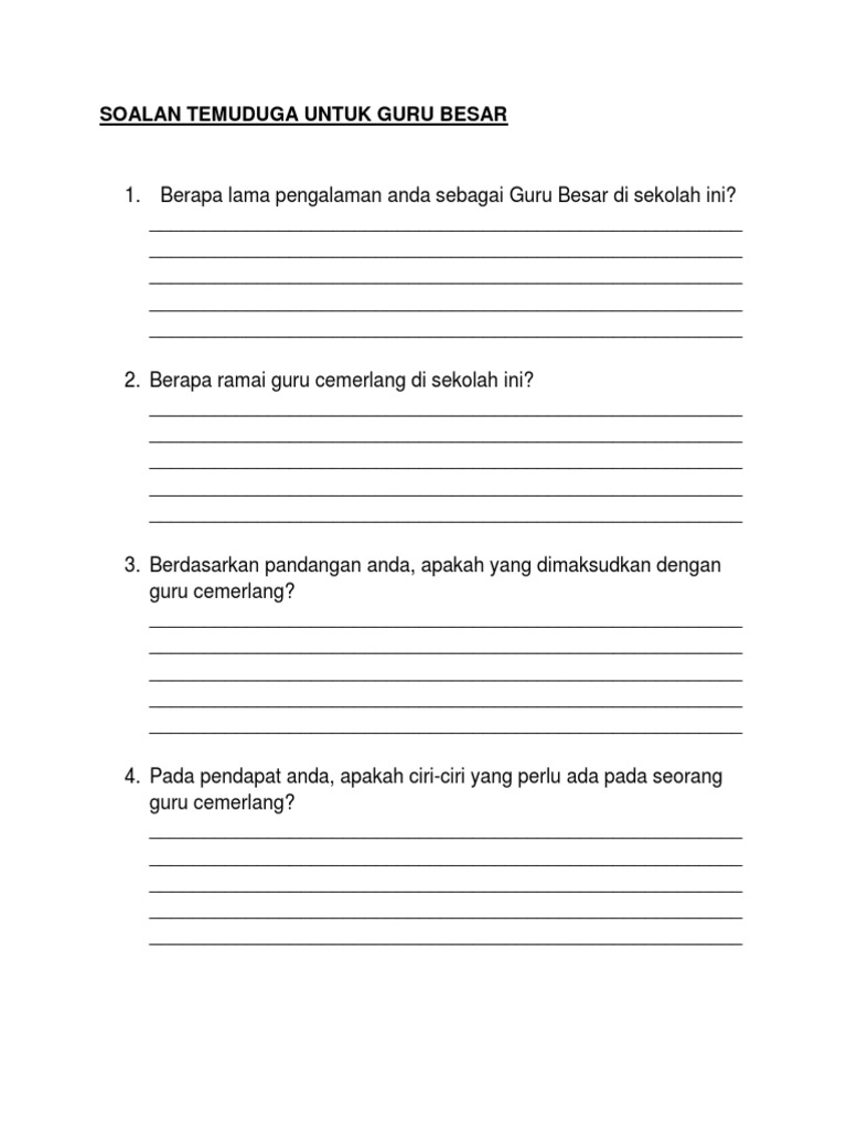 Ana Sayfa Blog Contoh Soalan Temuduga Guru Besar Contoh Soalan Temuduga Guru Besar. Adakah anak saya belajar kemahiran asas seperti huruf dan nombor. Doa untuk pergi temuduga kerja.